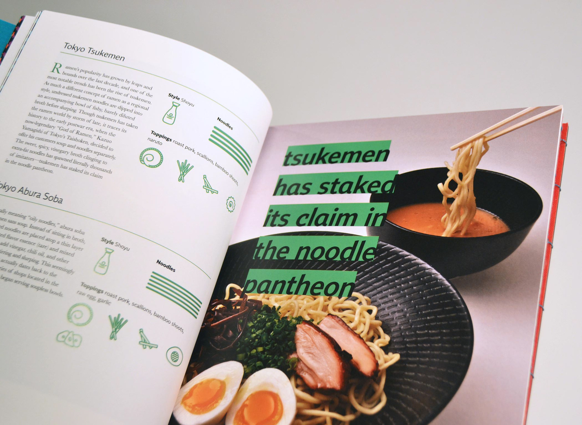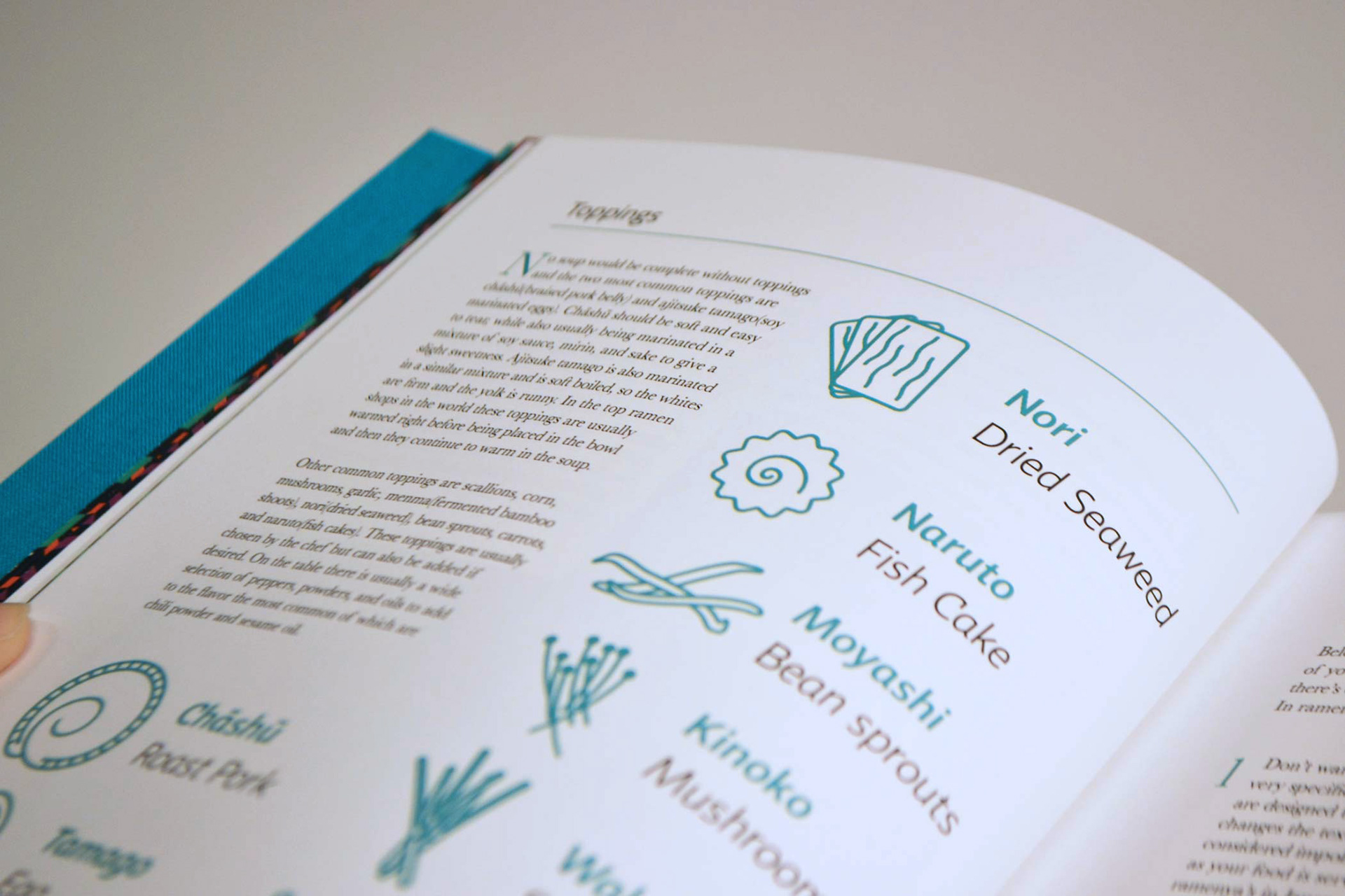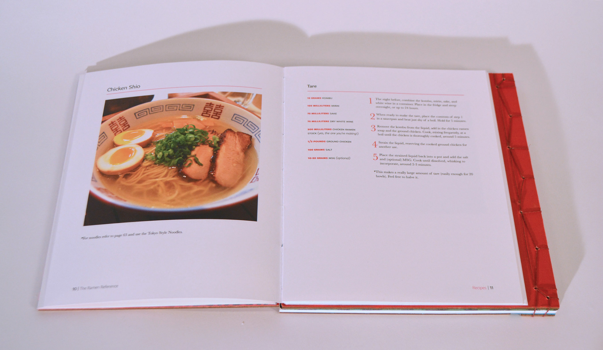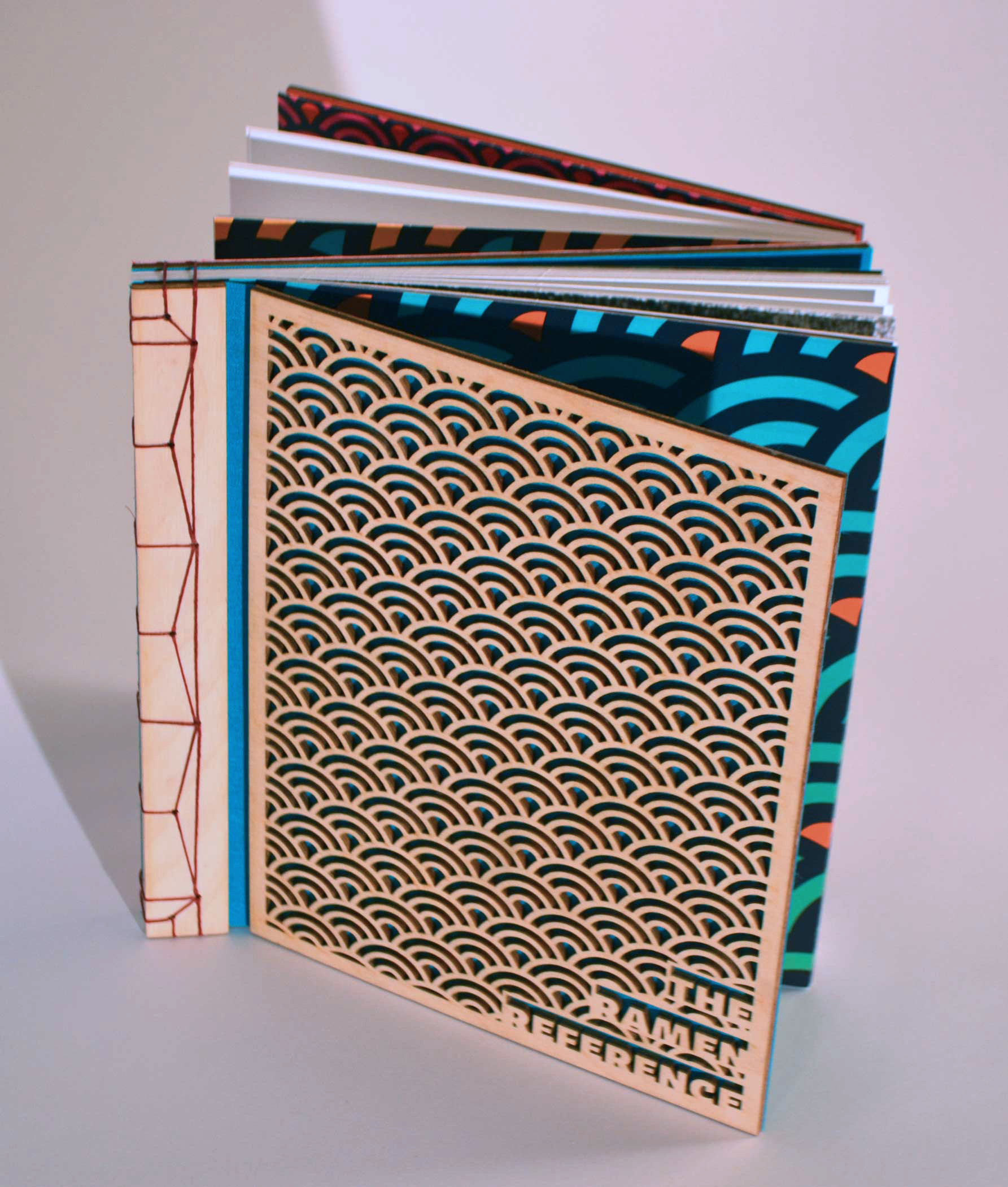 The Ramen Reference cover is hand bound using Japanese stab binding while the reverse side, The Recipe Reference, is bound using coptic stich so that it can lay flat while cooking.