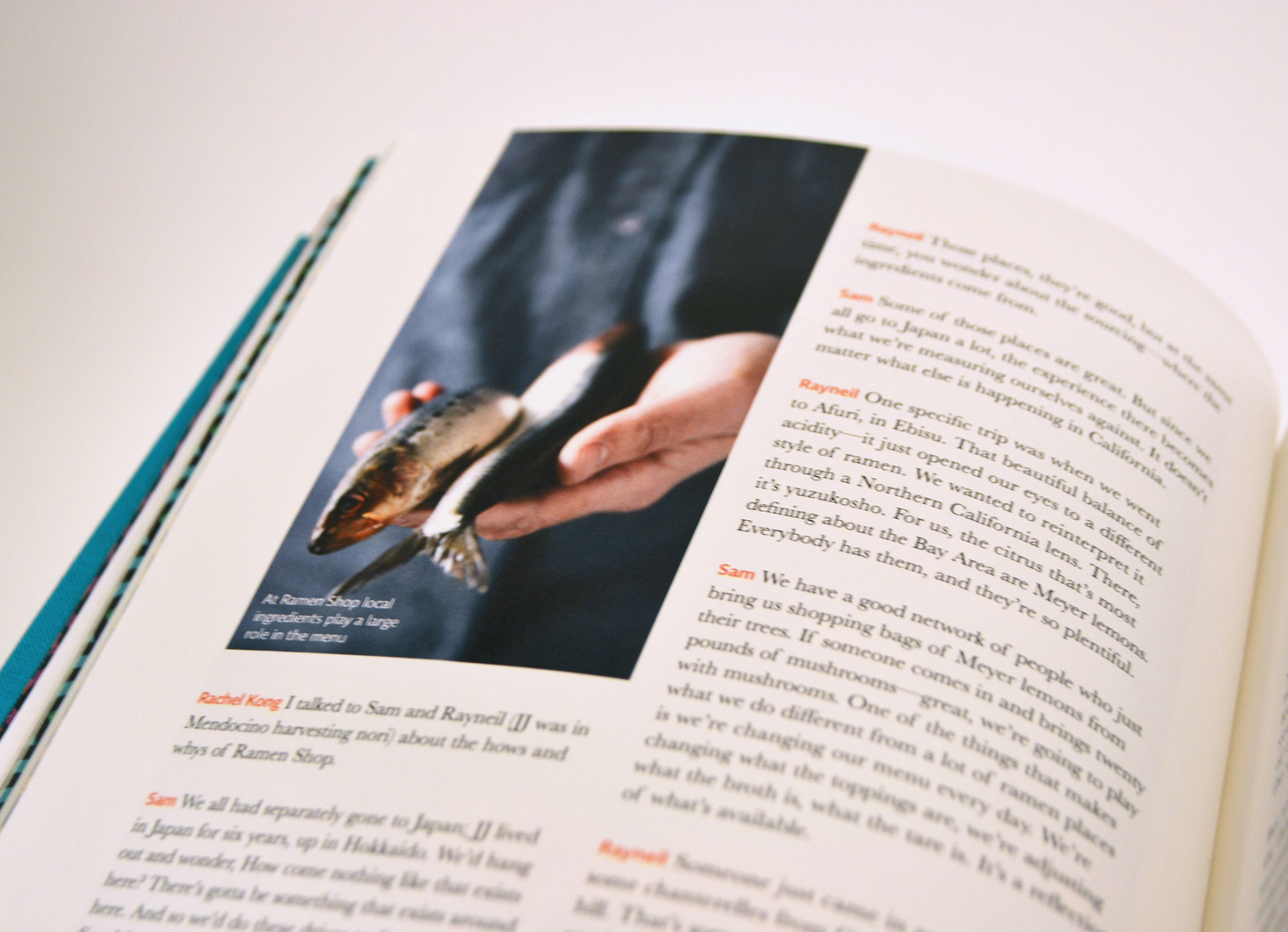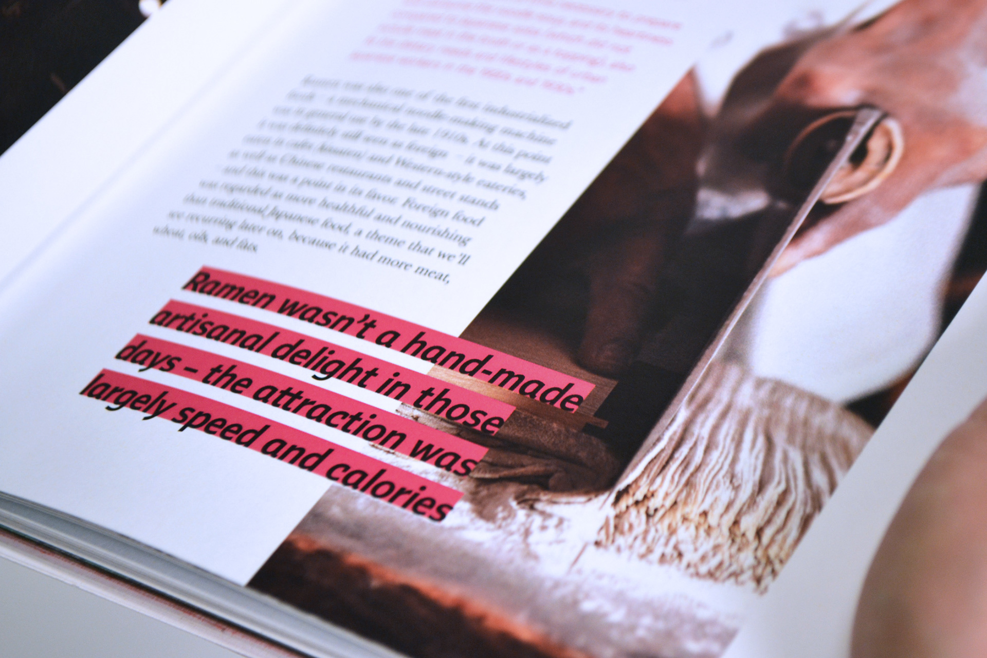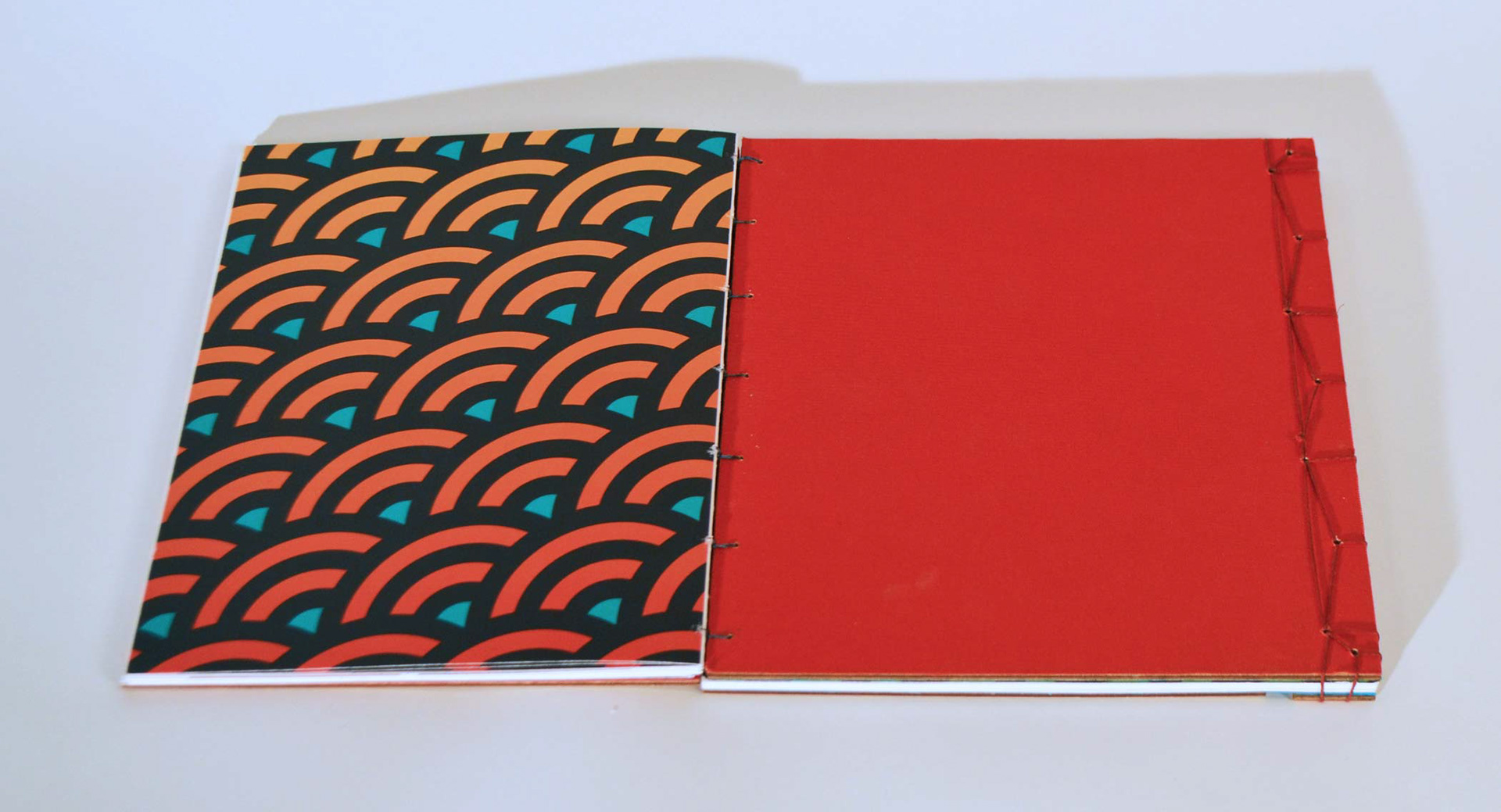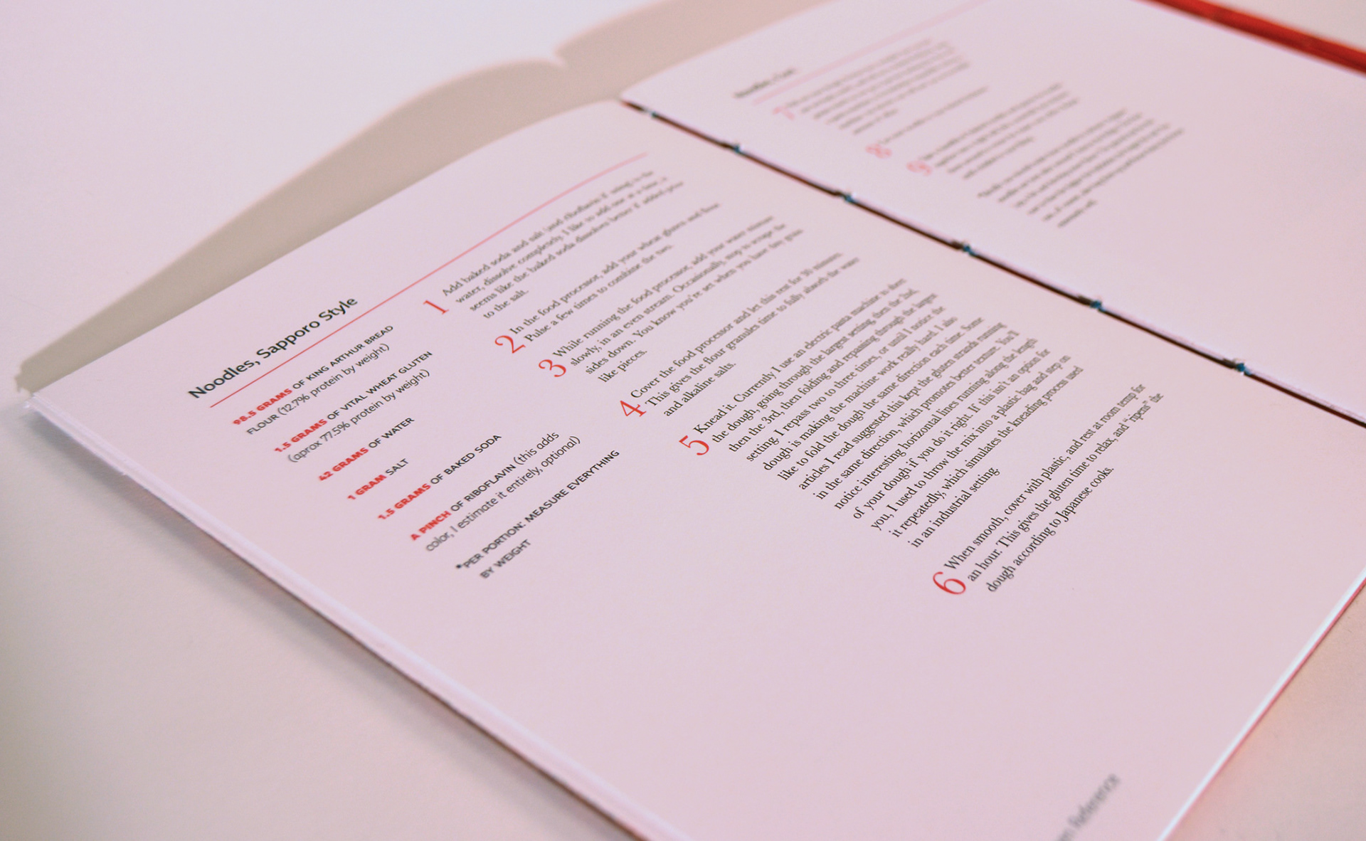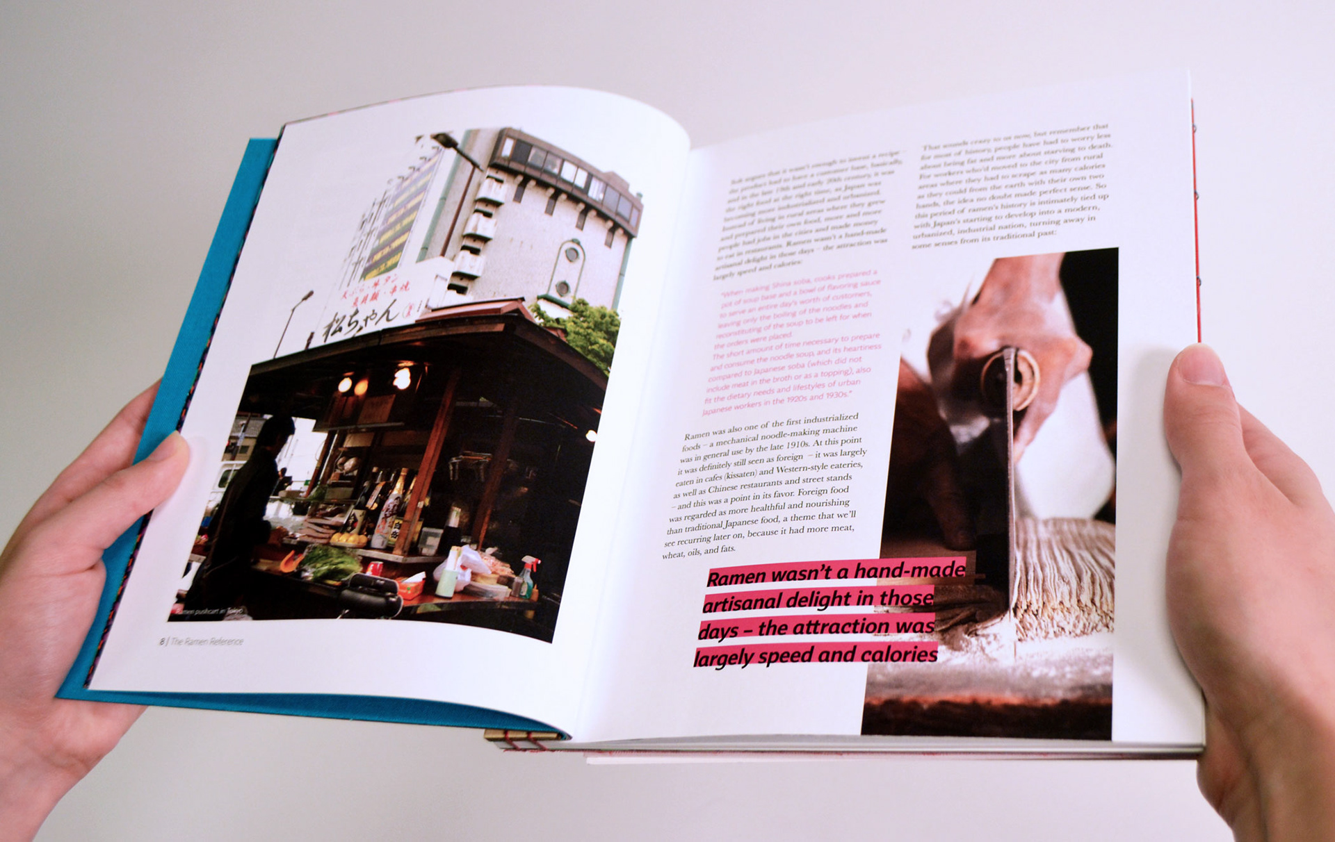 The Ramen Reference cover is hand bound using Japanese stab binding while the reverse side, The Recipe Reference, is bound using coptic stich so that it can lay flat while cooking.